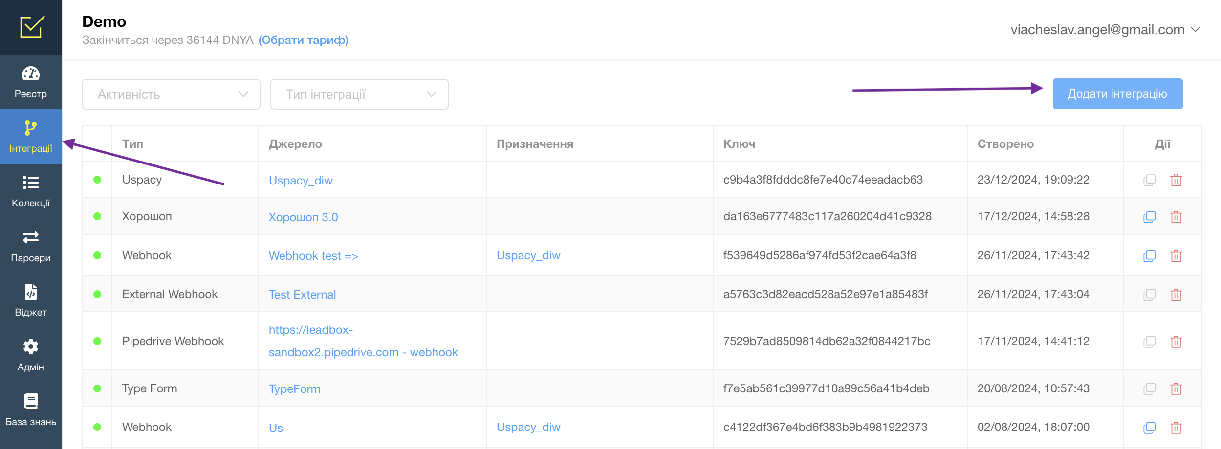 Якщо ж просто зайти на сторінку Інтеграції сервісу LeadBox, то побачите перелік вже підключених та налаштованих у вашому акаунті LeadBox сервісів. Вони мають такі параметри: